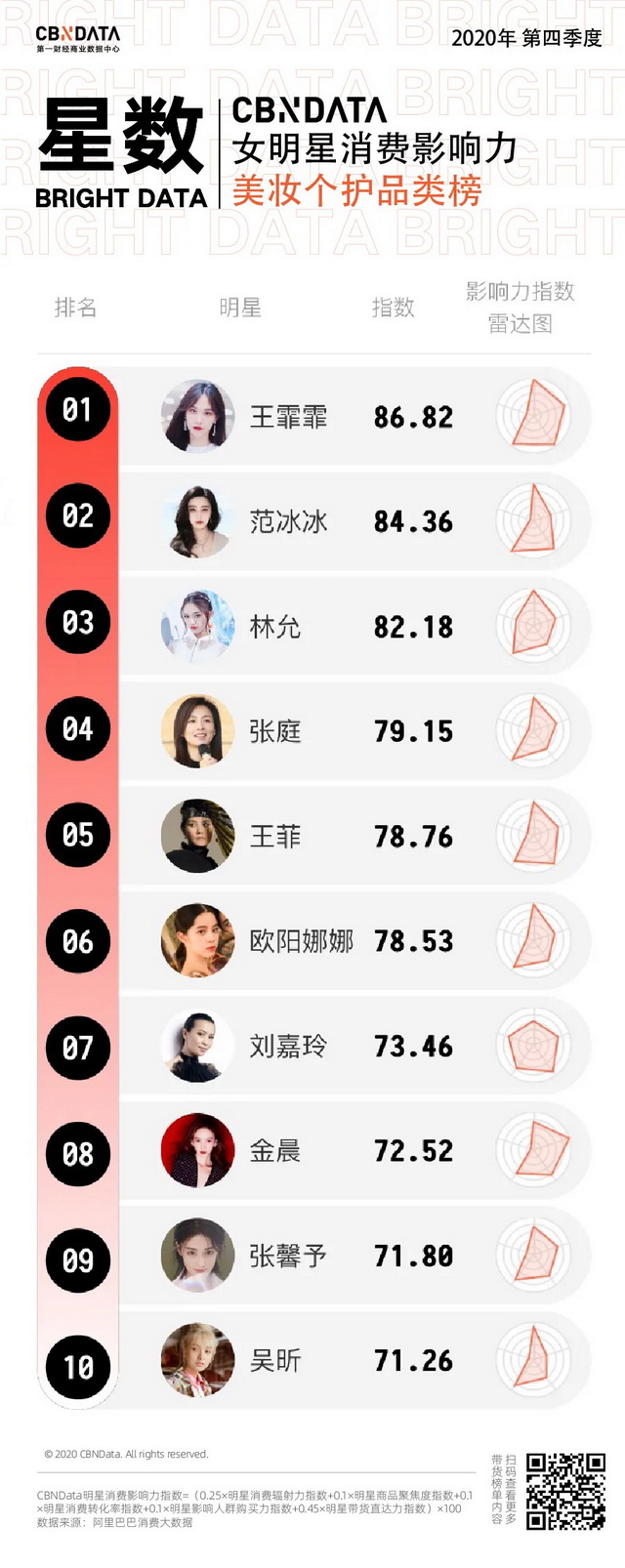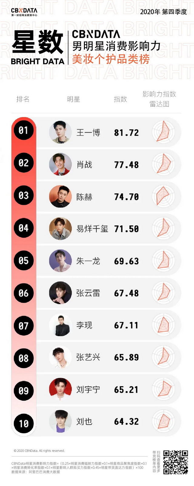 1月25日,第一财经商业数据中心(CBNData)星数发布了2020四季度“CBNData星数明星消费影响力榜”,本期榜单基于阿里巴巴消费大数据,以2020年第四季度为测算周期,发布了1个季度总榜、2个性别榜、4个代际榜、7个品类榜及20个城市榜,通过综合“明星消费辐射力、明星消费转化率、明星带货直达力、影响人群购买力、明星商品聚焦度”五大明星消费影响力指数,综合衡量明星消费价值。