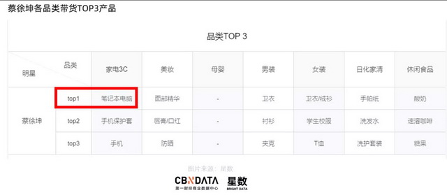 以蔡徐坤为例,四季度蔡徐坤仅新增惠普电脑一项代言,但根据CBNData星数淘系带货数据,在家电3C品类,蔡徐坤的带货排名直接上升了10个位次,最带货品类TOP1也由上一季度的手机保护套变为新代言的笔记本电脑,足见一个优质代言对明星商业价值的提升效果。