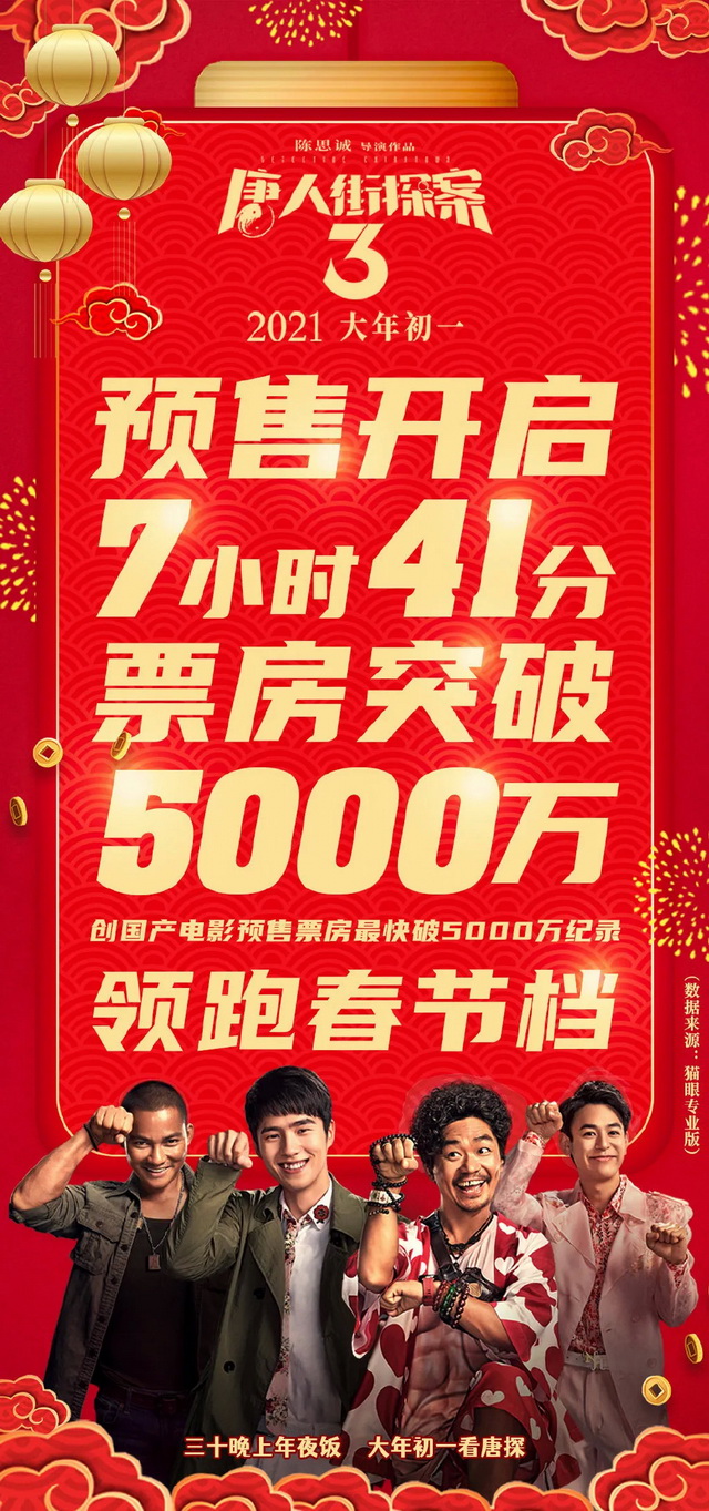 数据成绩也证明了这点。在29日下午4点,《唐探3》预售票房超过5000万,成为历年春节档预售最快突破5000万的电影。