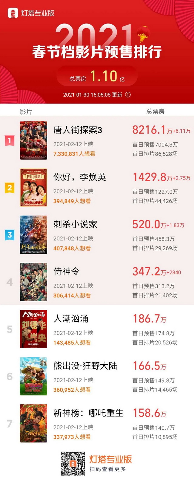 根据灯塔实时数据,春节上映的七部电影中,《唐人街探案3》(以下简称《唐探3》)以超8000万的预售一骑绝尘,《你好,李焕英》预售也破千万居第二位。春节档电影在1月29日早8点全面开启预售,首日预售票房就突破了7500万。