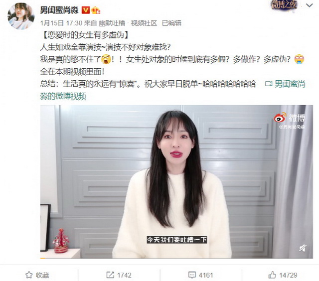 比如《恋爱时的女生有多虚伪》这个视频,点进去会发现,尚淼的吐槽就像生活中女生闺蜜之间相互吐槽一样,虽然颇为犀利,但却满含温情,让人捧腹大笑之余,毫无被冒犯之感。