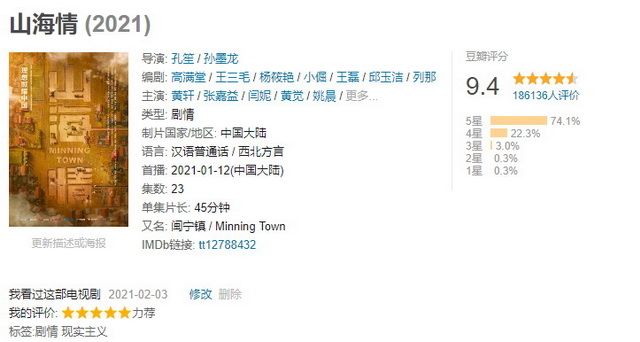 豆瓣上评分9.4,近20万人点评,让《山海情》成为近年来国剧中罕见的高分佳作,已然晋升为国剧第一梯队。广受网友喜爱之外,这部剧也受到《人民日报》、《新华社》等官方媒体的点赞,认为“拍出真情实感,赢得共情共鸣”。