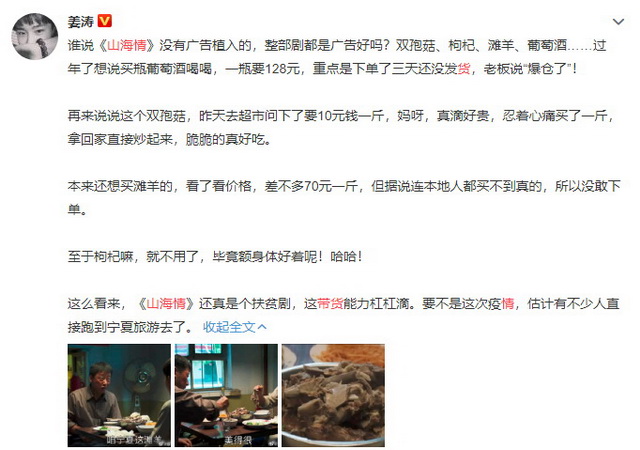 一部山海情,一卷脱贫史,在展示宁夏贫困地区脱贫史诗的同时,也向全国观众尽情展示了宁夏丰饶的物产,网友评论道:整部剧都是带货现场。