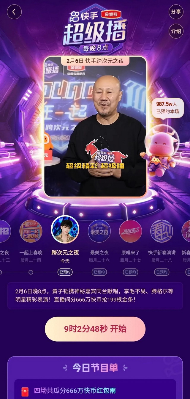 给丁真提供表演舞台的“过招牛人之夜”,是快手近期的系列主题直播之一,在2月1日-2月26日长达一个月的时间里,节目化的直播内容每晚8点在快手播出,被统称为“超级播”。
