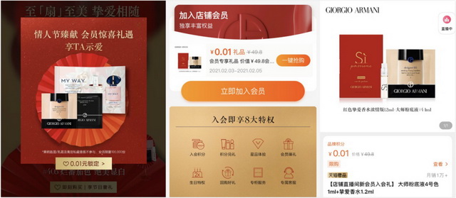 如今,观察电商平台的大牌官方旗舰店我们可以发现,不少店铺都以“入会送礼”的方式来吸引消费者成为店铺会员,只要注册会员,即可低价获得产品小样。比如在阿玛尼官方旗舰店的新年活动中,只要用户成为阿玛尼会员,即可用0.01元获取香水、粉底小样。