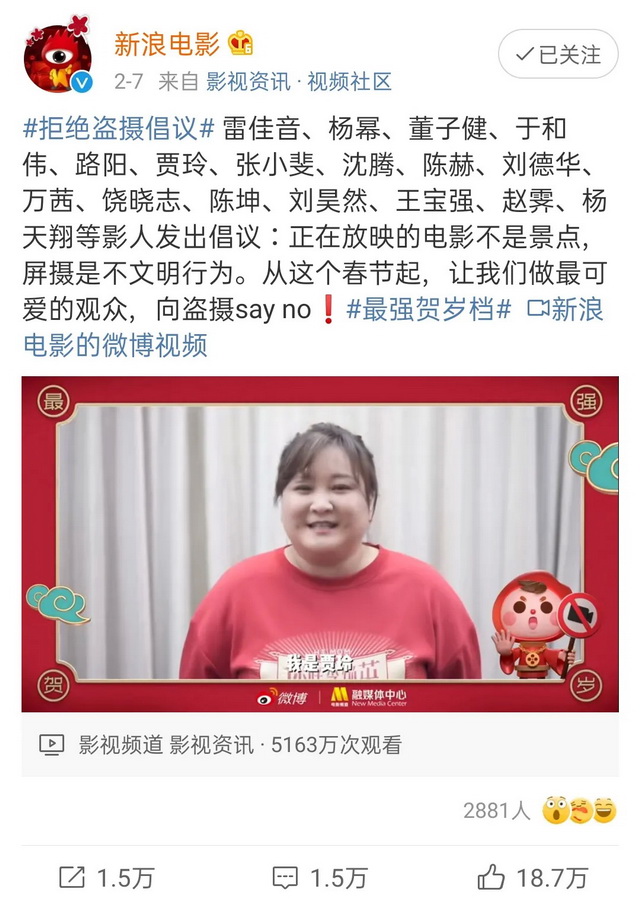 2月7日,雷佳音、杨幂、董子健、于和伟、路阳、贾玲、张小斐、沈腾、陈赫、刘德华、万茜、饶晓志、陈坤、刘昊然、王宝强等电影人发出拒倡议:文明观影,拒绝盗摄。