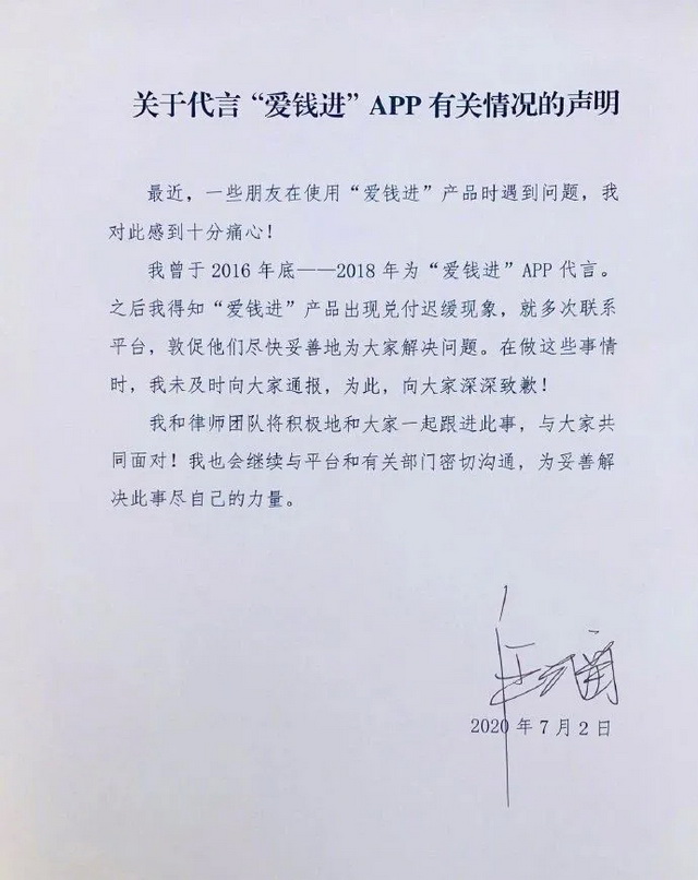 去年7月,爱钱进APP涉嫌非法吸纳公众存款而被立案侦查,受害人达到37万,被骗总额230亿。随后,爱钱进的前代言人汪涵发布声明称,他曾经知悉产品的兑付出现迟缓,也多次联系平台敦促解决问题,但并未及时向公众通报,并对此进行道歉。