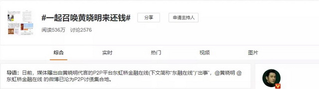黄晓明也在东虹桥金融出现兑付逾期事件后,由工作室出面澄清。声明指出,黄晓明只参与了东虹桥金融的一个助力创业者的贷款项目,除此之外没有其他合作。同时,声明要求对方删除所有宣传信息——5个月前,黄晓明的肖像出现在上海外滩的巨幅广告上,广告语是“贷你圆梦,赚多多的钱。”