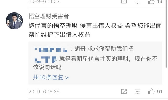 因此,P2P爆雷受害者对明星的态度往往是求助和诉苦,而非追偿。在胡军去年9月宣传综艺节目的微博下方,受害者们纷纷评论,“希望您能出面帮忙维护下出借人权益”、“胡哥,求求你帮帮我们吧”。