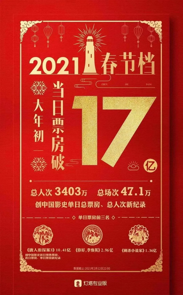 灯塔专业版显示,2月12日(大年初一)大盘报收17.36亿元(含服务费),较2019年同期的14.58亿增长了19%;观影人次达到3456.78万,比2019年同期增加了227万人次,两项指标均刷新了历史同期的最高。