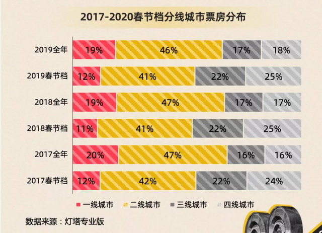 传统意义上,春节返乡过年,观影人群从一线城市流动到二三四线,带来下沉地区票房的增长。据《2020中国电影市场用户报告》,2017年-2019年春节档,近15%的票房占比从一二线转移到三四线。在2019年春节档,三四线城市票房占总票房比超过了40%。