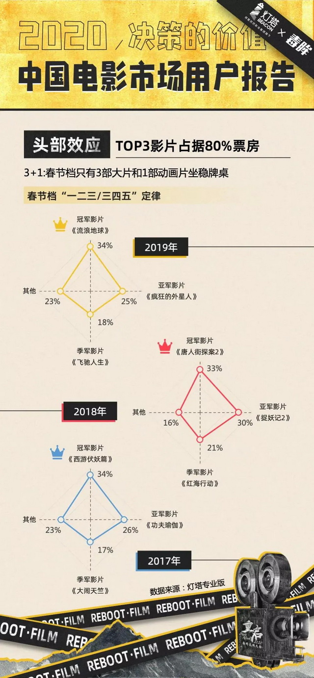 根据毒眸联合灯塔研究院发布的《2020中国电影市场用户报告》,过去三年春节档都体现出较强的头部效应,由三部头部电影收获了80%的票房,另外动画电影《熊出没》系列保持着稳定的票房产出,形成“3+1”或者“4+1”的票房格局。