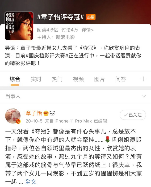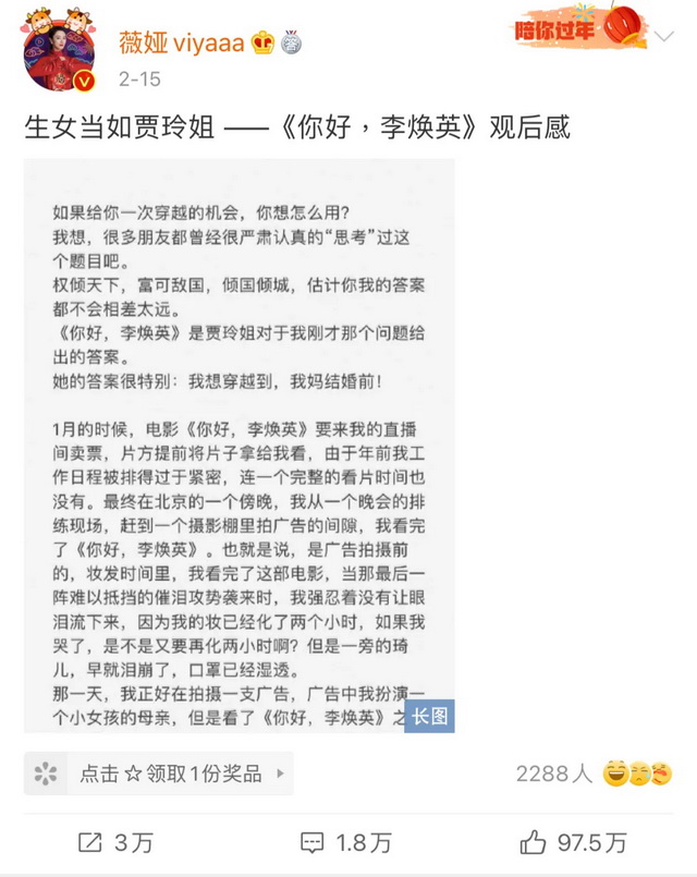 国庆档时,章子怡针对《夺冠》发表了自己的影评,登顶热搜第一,收获了4.6亿阅读量。今年春节档,薇娅发点评,让#薇娅发长文谈李焕英# 登热搜首位;李现看完《刺杀小说家》表达对影片的喜爱,片方知悉后能即时进行反馈、互动。