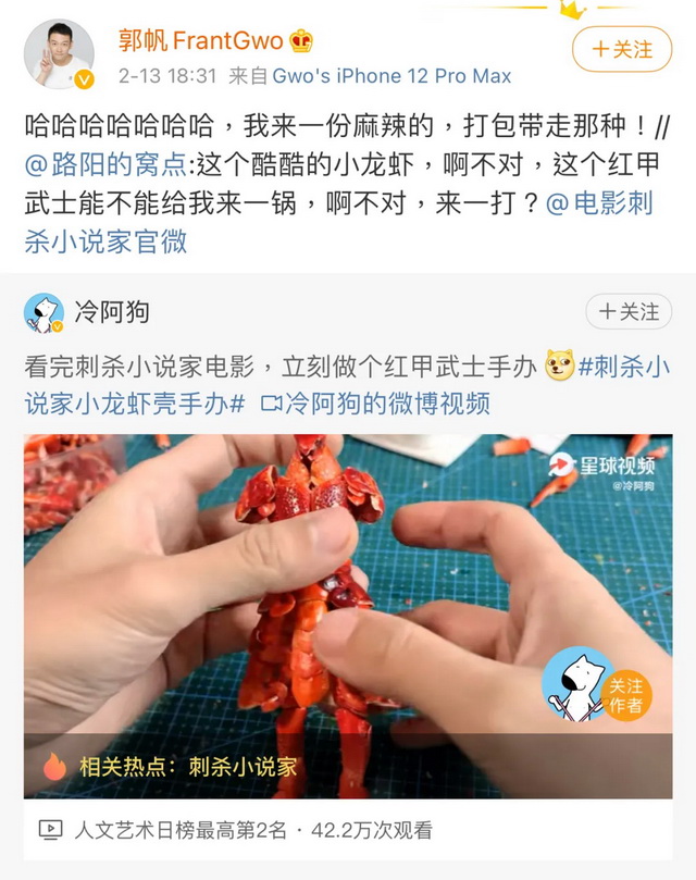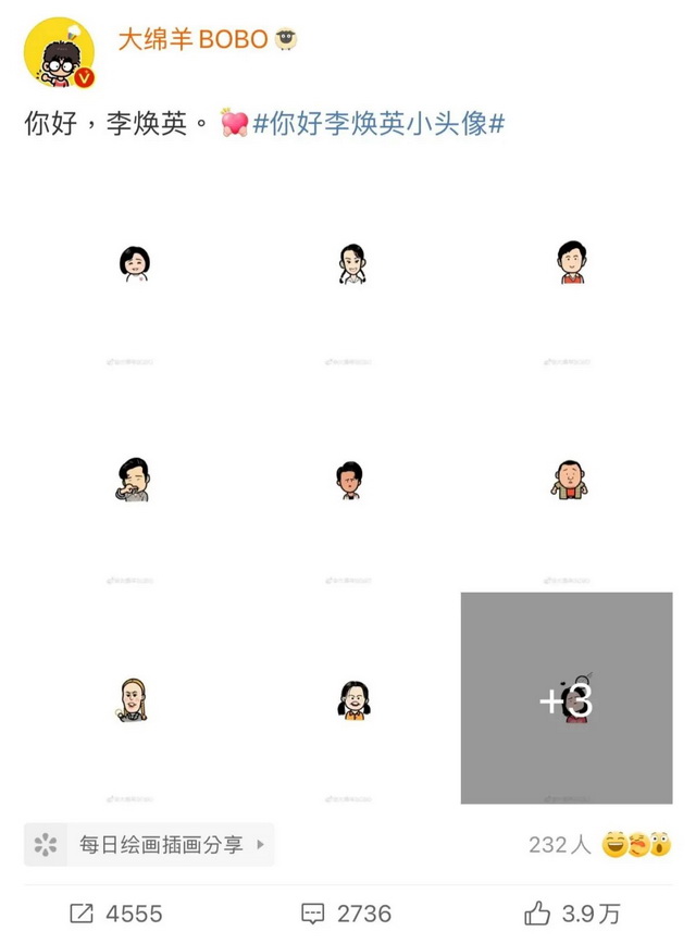 漫画博主@大绵羊BOBO看完电影后,创作了《李焕英》卡通头像,话题#你好李焕英小头像#登上微博娱乐榜。设计美学博主@冷阿狗 制作了《刺杀小说家》雷佳音饰演角色的创意模型,不仅收获了路阳、郭帆关注,还被两位导演排着队调侃玩梗。点开话题#唐探名场面模仿#,你能收获一大堆模仿思诺、宋义(唐探角色)的趣味内容。