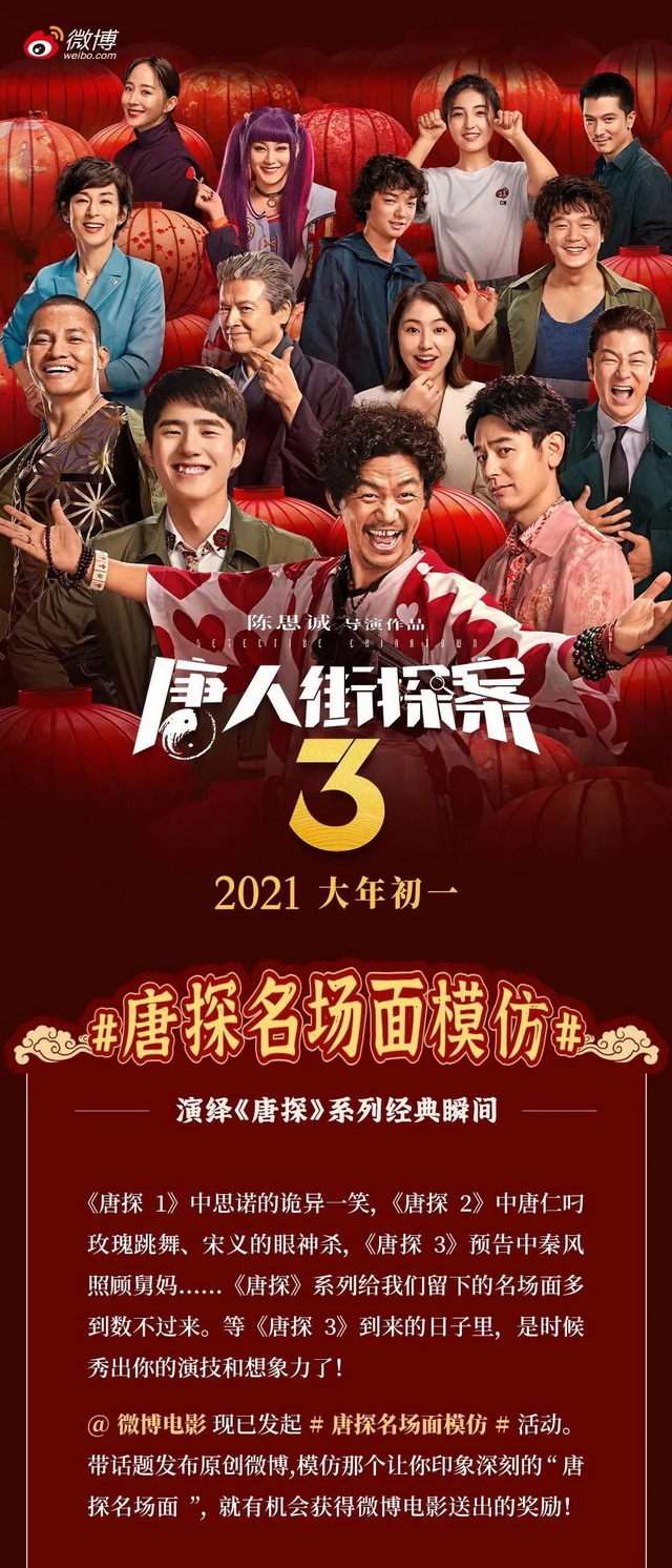 微博电影和《唐探3》官博共同发起了#唐探名场面模仿#,邀请影迷带上话题模仿电影中经典场景,赢取奖品。奖品包括现金红包和电影周边。