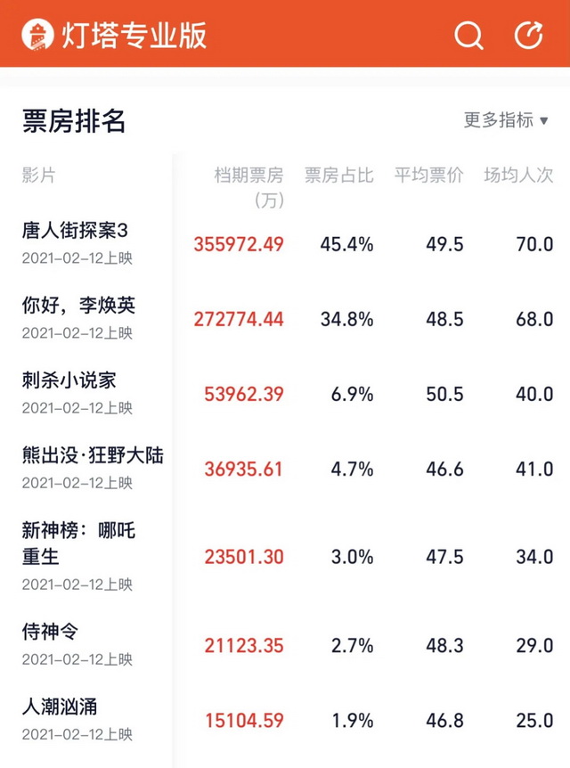 票价上,2018年春节档的平均票价是39.7元,2019年涨到44.7元,今年在这个基础上又涨了4.2元,48.9元“史上最贵”的平均票价,比2018年贵了9.2——高票价在某种程度上成为春节档新纪录的重要推手。