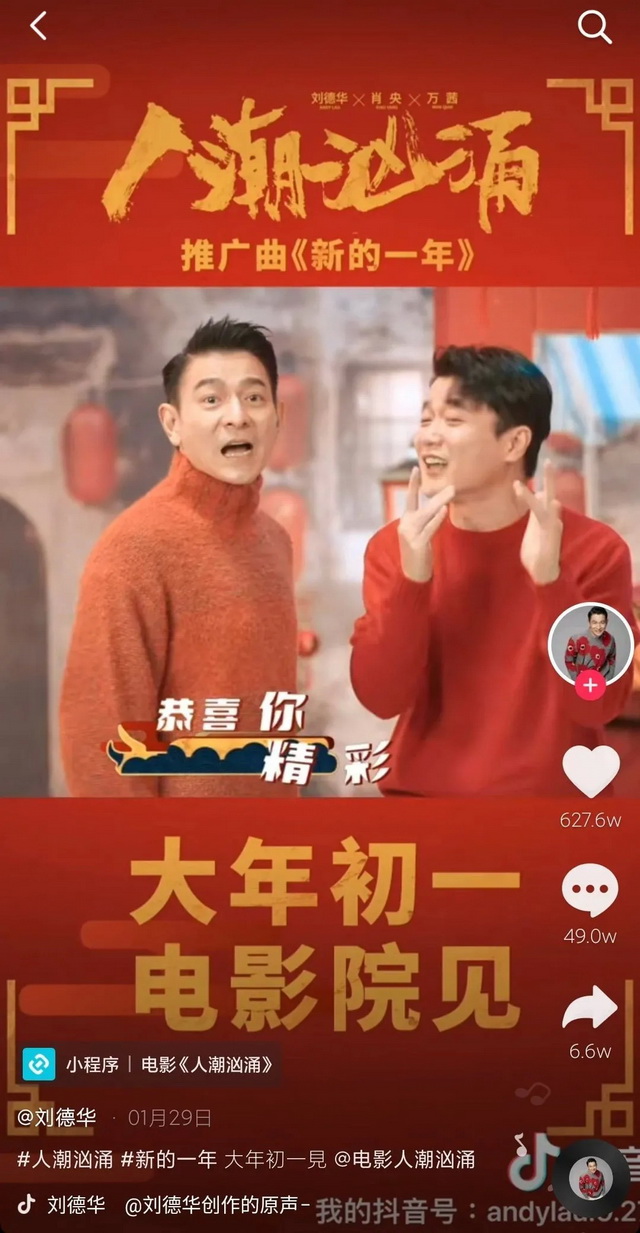 今年春节档影片的营销也明显地集中在短视频阵地,只不过转化效果充满变数、以刘德华主演的《人潮汹涌》为例,刘德华在映前宣传期内入驻抖音,仅48个小时就拿下了超过四千万的粉丝,且为影片拍摄了多支宣传物料,在该片的抖音官方号的视频物料里,也把“刘德华”用到了极致,但最后影片仍然处于春节档票房排名最末。