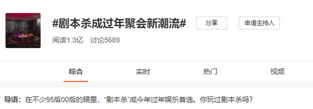 在不少95后、00后的眼中,剧本杀成为了他们新的聚会首选。这样的趋势,在话题#剧本杀成过年聚会新潮流#高达1.3亿的浏览量中,我们或许能够窥见一二。