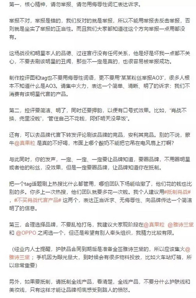 除了让肖战的部分粉丝们长记性,做出此举的网友被触怒的关键可能还是举报本身。网友“免庖丁”就在微博发布了长文“抵制指南”,表示要通过抵制的形式来反对饭圈的举报行为。“吃到足够的苦头,整个粉圈都会铭记一件事:不能举报。”