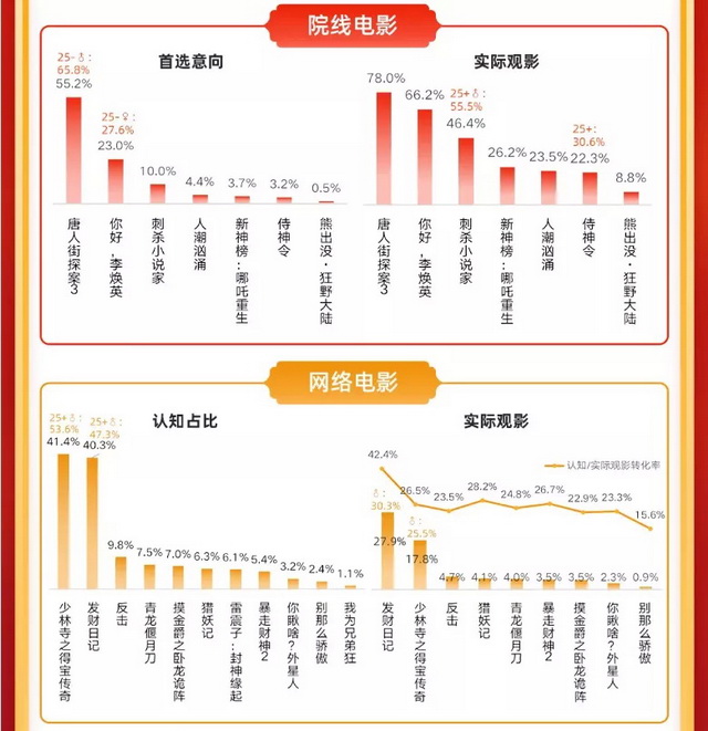 不论院线还是网络,影片的头部效应都很明显。由唐季礼执导、王宝强主演的《少林寺之得宝传奇》和宋小宝、马丽主演的《发财日记》吸引了最多关注,在观众间的映前认知占比分别高达41.4%和40.3%,甩开其它影片数个身位,第三名《反击》的这项数据仅为9.8%。