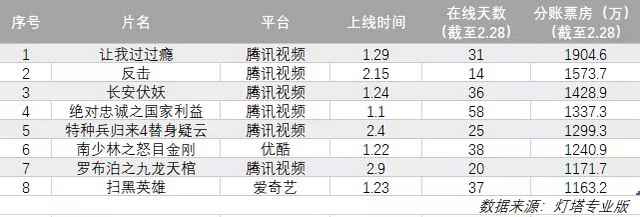 纵观开年前两个月,网络电影的整体市场水准也不如去年同期。截至2月28日,爱优腾三家平台共有8部新片票房分账突破千万。