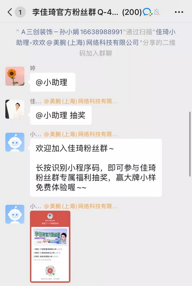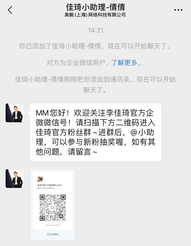 微信群,是一个私域流量沉淀和唤醒的重要场所。李佳琦的粉丝们想要加入官方微信群,需要先添加“佳琦小助理”企业微信,企业微信以一对一的方式触达粉丝,连接主播和用户,除了日常沟通,也会发挥引导粉丝入群的作用。