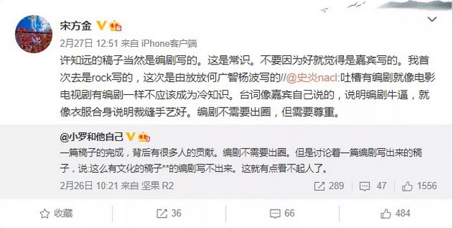 上过两次《吐槽大会》的编剧宋方金也转发了这条微博,“许知远的稿子当然是编剧写的,这是常识。”并点出两次为他写稿的编剧姓名。