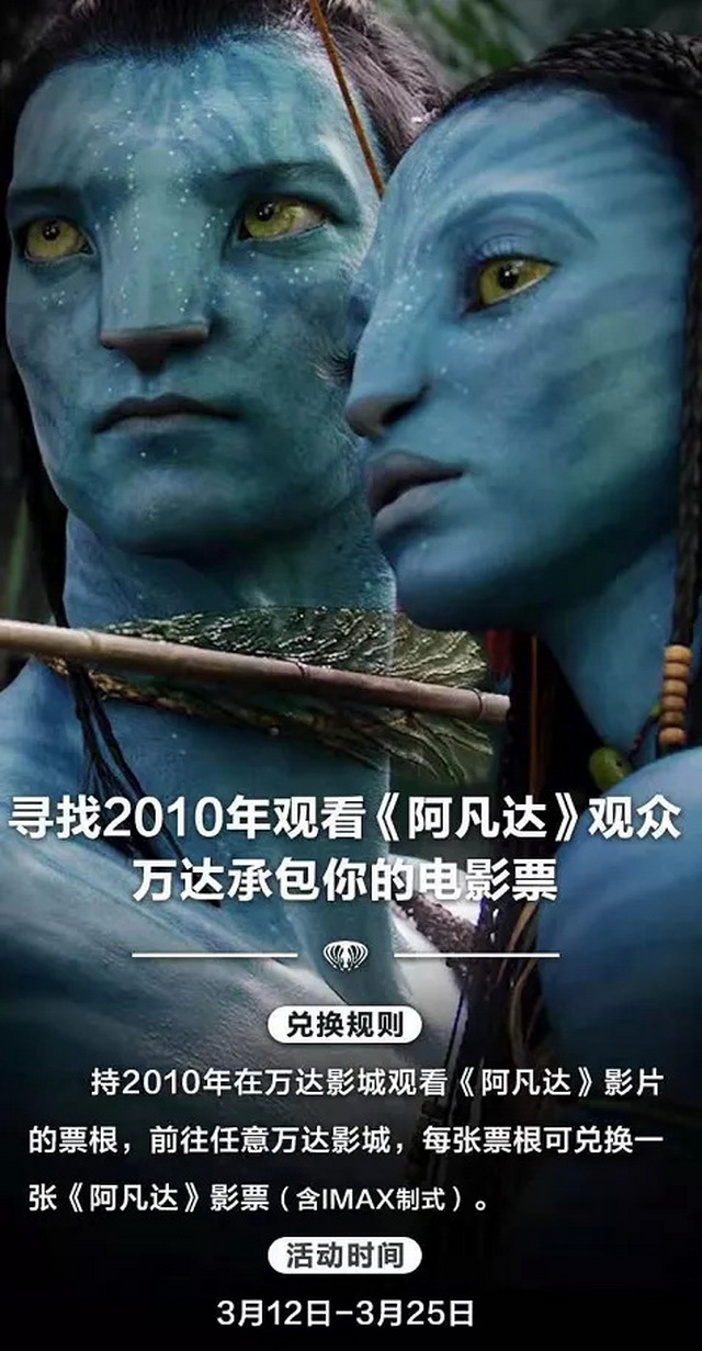 此外,不同于国内多数院线在本次《阿凡达》重映过程中的毫无准备。在《阿凡达》官宣定档当天,万达电影就推出了“10年前旧票换新票”、全国万达影城统一定价:3D版29.9元、3D IMAX版49.9元等活动。