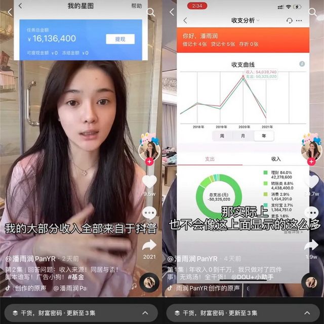 前有95后美妆博主潘雨润晒出收支账单,自称“年收入1600万”,后有00后搞笑博主韩佩泉(在短视频平台化名韩美娟)登上选秀舞台,为实现唱跳梦想“少挣600万”。