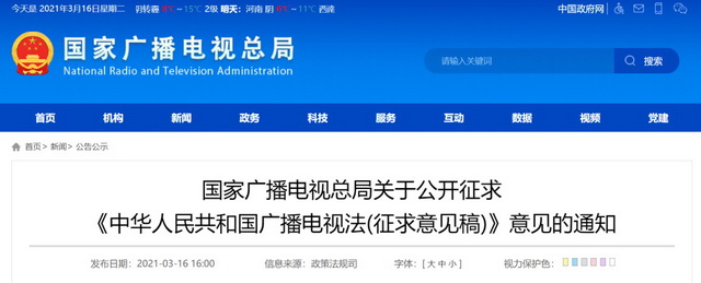 3月16日,国家广播电视总局发布了《中华人民共和国广播电视法(征求意见稿)》,正式启动对起草的广播电视法的征求意见。这是中国首部广播电视法,也是继《电影产业促进法》之后,影视文娱产业的又一部法律。