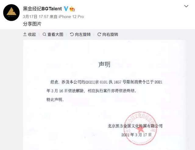 其间一个小反转是,此条限制消费令在3月16日解除。但这次的事件却尚未停止喧嚣,黑金娱乐CEO尚雯婕连上两次热搜,黑金经纪从2018年就开始的纠纷也再次被呈到公众面前。