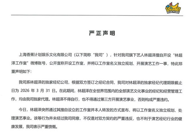香蕉娱乐对林超泽成立新工作室一事发布的声明