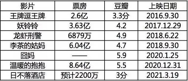 但也有如《李茶的姑妈》这类随影片口碑一同翻车的案例出现。当时豆瓣热度最高的一条短评写道:“开心麻花出品,凡是沈腾主演的,就可以一看,别的暂时不用。”