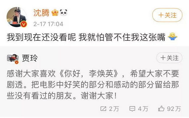 在《你好!李焕英》上线前,同样有媒体曝光“沈腾出演仅8分钟”。宣发团队立刻表示,沈腾确为影片主演之一。《你好!李焕英》首日观影过后,则有部分观众发帖表示沈腾确为影片男一号。