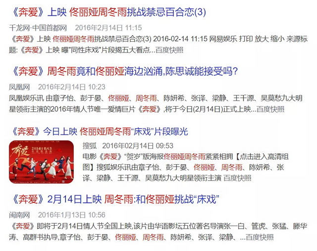 2016年上映的《奔爱》前期宣传中,曾大肆宣扬主演周冬雨与佟丽娅的同性之恋,然而看到正片之后观众才发现,她俩的故事首先只是电影三个独立故事之一,所谓的同性之恋也只是打打擦边球。