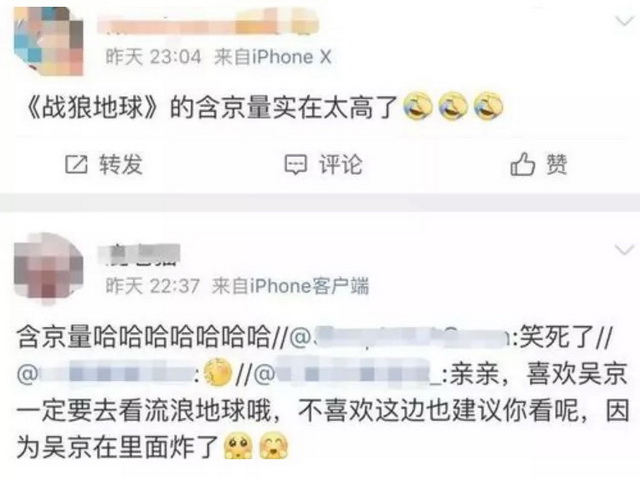 对沈腾的形容并非首创,形容吴京的“含京量”也曾风靡一时。但与“含腾量”不同,“含京量”并非一件单纯的好事。对喜爱吴京的观众,“含京量”高能促使他们购票,但对于抵触吴京的观众而言,“含京量”高反倒成为观影决策的劝退因素。