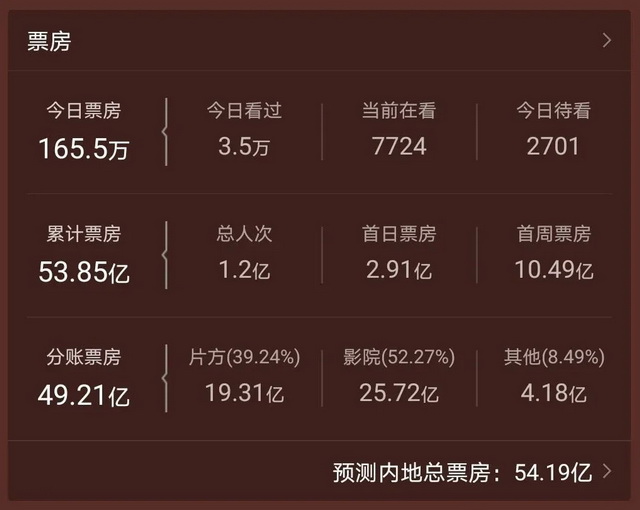 上映50天,票房53.8亿。9天后影片密钥到期,按照目前每日新增票房估算,最终票房可能超过54亿,贴近《战狼2》56.9亿的票房。