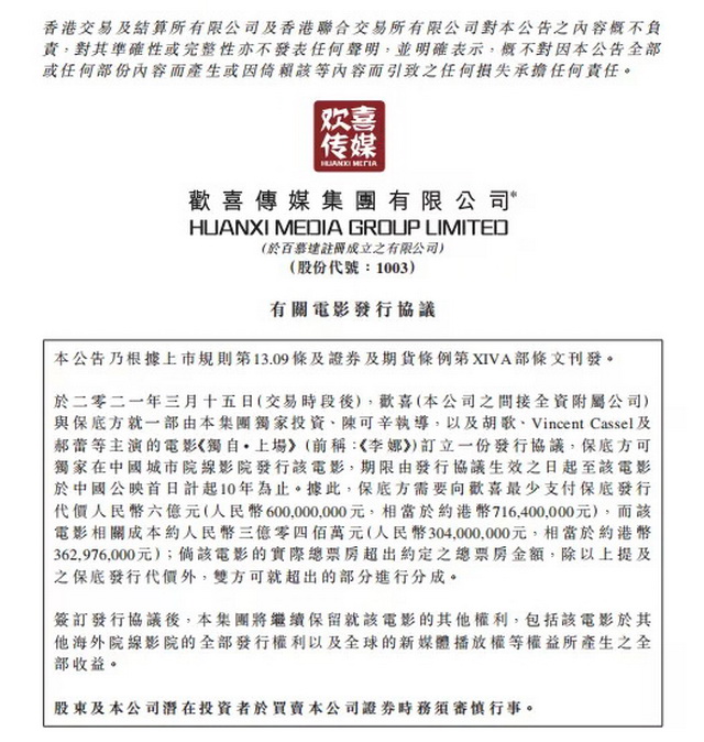 半个月前,华文映像为陈可辛导演的影片《独自.上场》保底发行,6亿保底费剔除3.04亿成本,出品方欢喜传媒尚未发行已稳赚3亿元。按照测算,这部影片上映后票房达到18亿以上,华文映像才能收回成本。