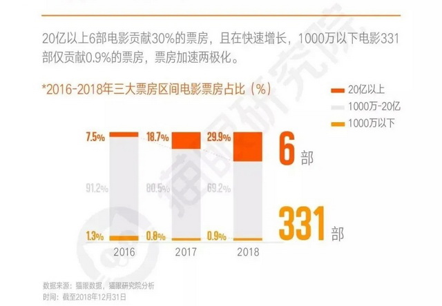 2018年,在国内上映的400多部影片中,票房前十的影片占全国总票房的三分之一,而票房在百万元以下的影片达300多部,大量影片无法上映。