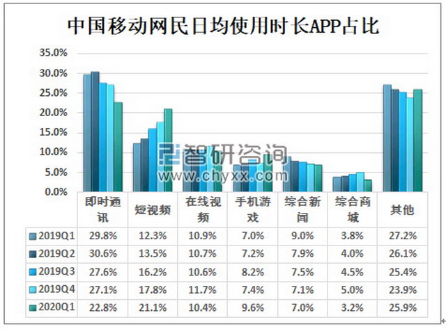 2020年一季度,短视频APP日均使用时长占比仅次于即时通讯,达21.15%,而在线视频APP日均使用时长占比则为10.4%,只有短视频一半不到。