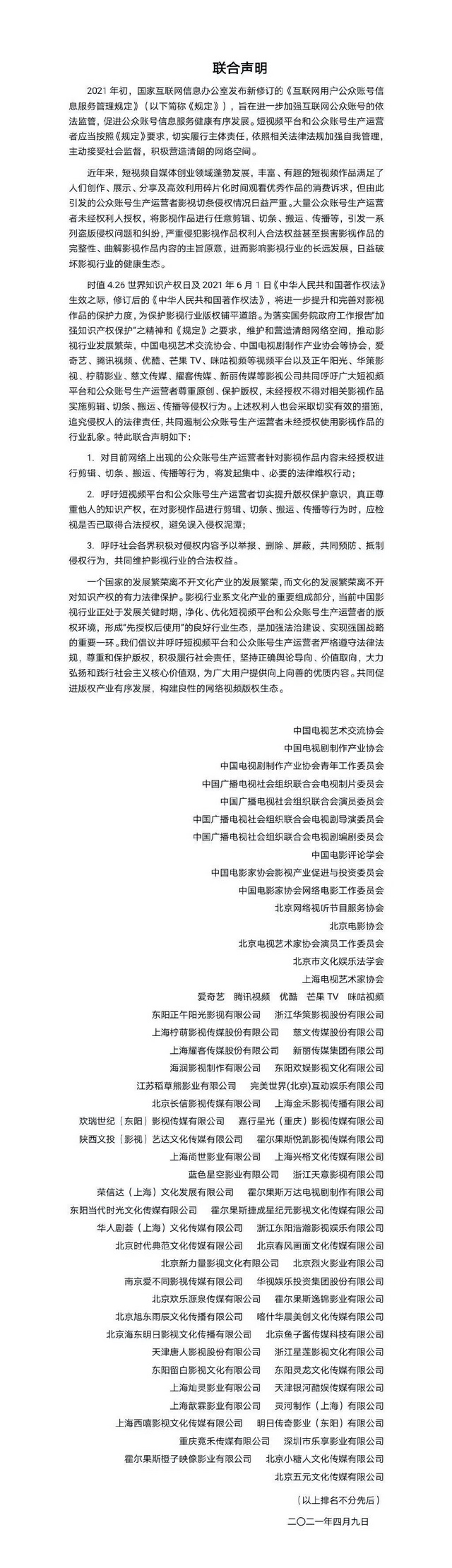 在2021年4月9日,53家影视公司、5家视频平台及15家影视行业协会发表联合声明,宣布将对网络上针对影视作品内容未经授权进行剪辑、切条、搬运、传播等行为,发起集中、必要的法律维权行动。