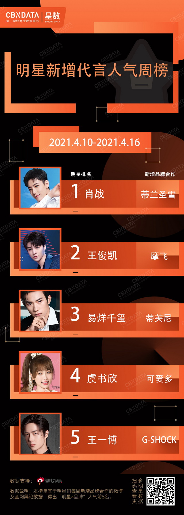 每周梳理明星新增代言事件,为品牌及市场提供明星带货力的客观参考。明星相关消费影响力指数及排名来源于CBNData星数罗盘。