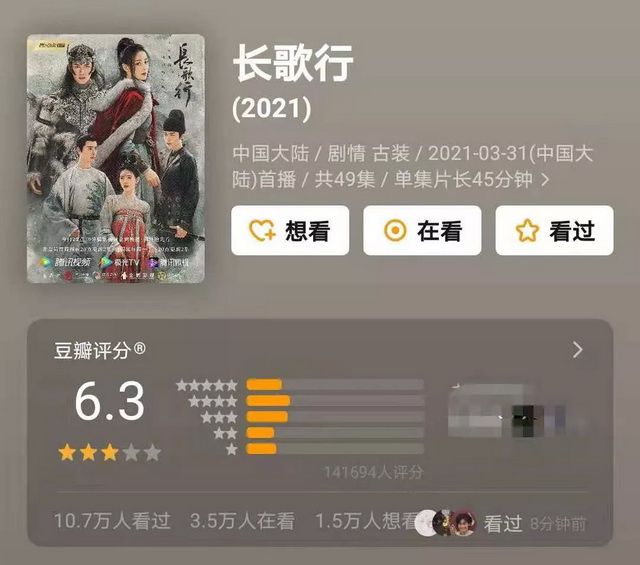 但结果似乎并不如人意,迪丽热巴深陷“艳压之战”,《长歌行》本身的豆瓣评分也仅有6.3分,刚刚跃过及格线。