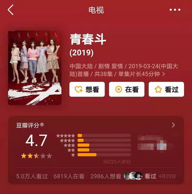 她的演技也似乎停滞不前,从出道作直至去年,角色形象仍然固定在青春片女主,但比起出道时的清纯形象,观众已经不买她的账了——去年郑爽主演的《青春斗》,豆瓣评分只有4.7,是赵宝刚导演口碑最差的影视作品。
