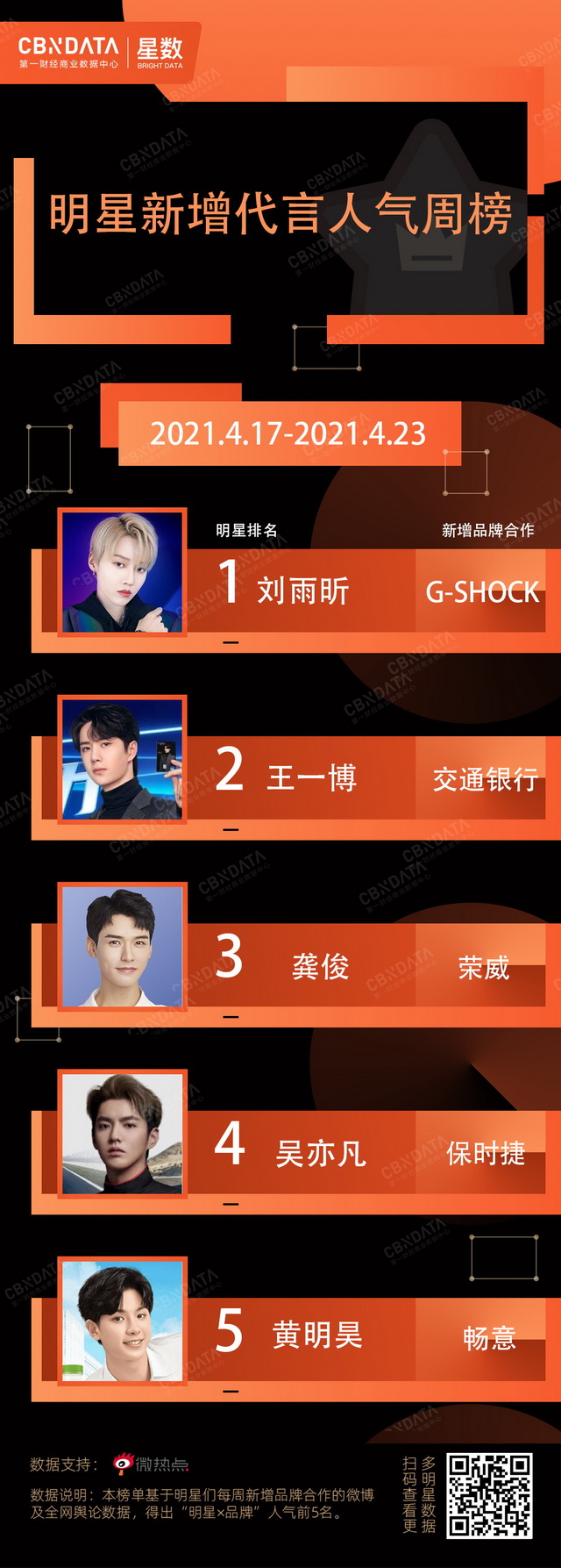 榜单基于明星每周新增品牌合作的全网舆论数据,得出“明星×品牌”人气TOP5。