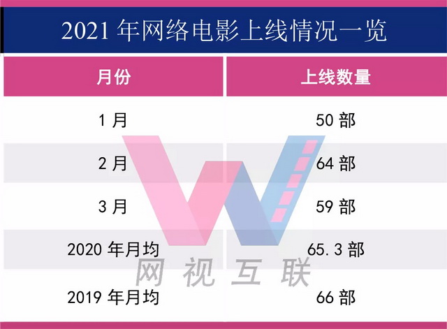 据云合数据,3月份全网上线网络电影共59部,数量上较2月份有所减少,不过这种浮动基本上保持在了一个正常的范围之内。