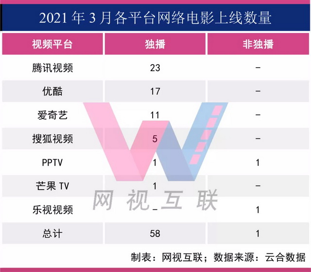 在59部上新网络电影中,有58部为独播作品,其中腾讯视频23部,优酷17部,爱奇艺11部,搜狐视频5部,PPTV1部。