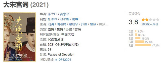 而《大宋宫词》,作为李少红导演新作,《大明宫词》的姊妹篇,虽然被观众寄予厚望,但开播后却争议如潮,豆瓣评分更是低至3.8,跟9.1的高分经典《大明宫词》形成了极大的反差。