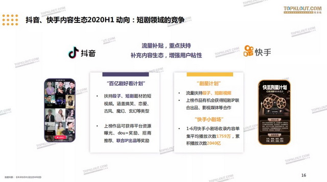 网络微短剧的井喷式发展,首先就体现在快手、抖音这两个短视频平台。据克劳锐《2020上半年短视频内容发展盘点报告》显示,2020年起,抖音、快手等平台就已经开始了在网络微短剧领域的竞争,相继发布扶持计划,以期打造出更好的短剧内容。