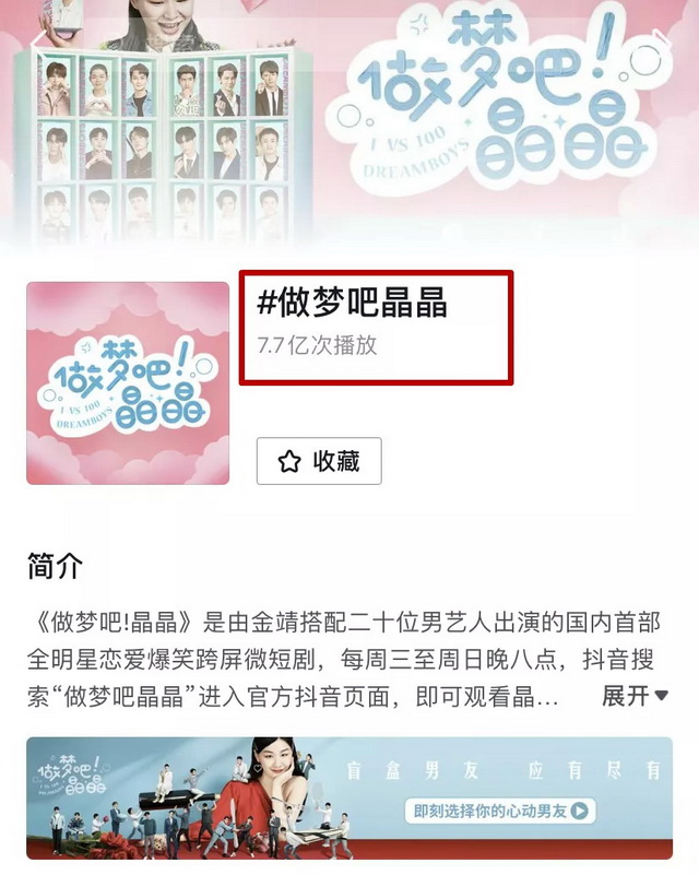 抖音也不落后,在短剧领域也产出了不少优质内容。比如今年年初推出的《做梦吧晶晶》,就获得了超7亿的话题量以及1.3亿的播放量,以明星效应大大提高了网络微短剧这一类目在市场上的普及率。